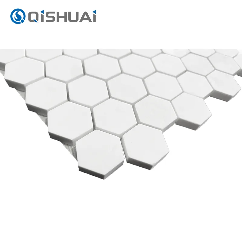 Het hoogwaardige Hex Alumina keramische mozaïek van Shandong Qishuai Wear-Resistant Equipment Co., Ltd., zoals afgebeeld, heeft een opvallend zeshoekig ontwerp dat ze onderscheidt van gewone vierkante of ronde tegels. Elke zeshoekige keramische mozaïektegel van aluminiumoxide heeft gladde, vloeiende randen met prachtige details die duidelijk zichtbaar zijn.